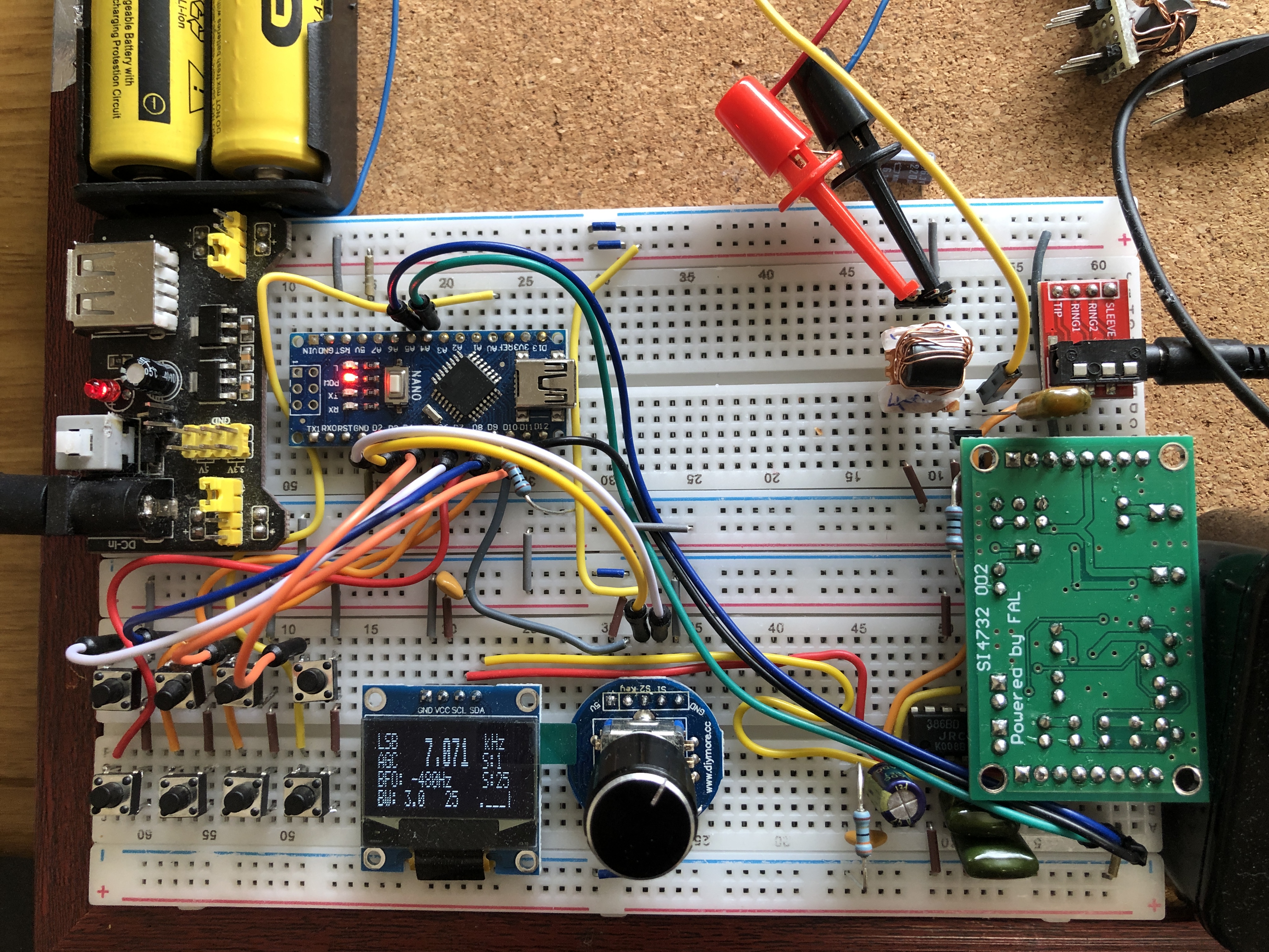 最初に組んだ配置だと、どうもデジタルノイズ(ピューというノイズ?)が大きかったのでくみなおして今の形になった。arduino nanoからSI4732基板をできるだけ離した形にした。